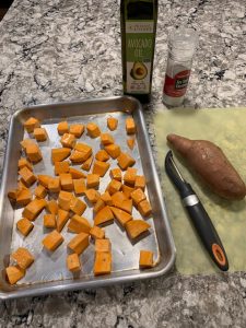 Select one small sweet potato per person, or a medium potato to serve two people. Peel, dice, toss the chunks in olive oil (or, I prefer avocado oil), sprinkle generously with salt, and “roast” on a cookie sheet in a 375-400 degree oven for 25-35 minutes (depending on how many are on your cookie sheet). Toss them once in the middle of the cooking time. They are done when they are brown on at least one side and a fork goes in easily. That’s it. The roasting brings out the sweet flavor, and if cooked correctly, they will have a slightly crispy outer layer, and be soft and creamy inside. Everyone will love them. Serve as a side, add on top of a spinach salad, or pop for a snack. (My kids dip them in ketchup!)
